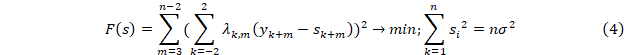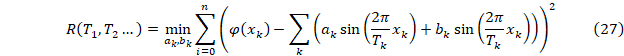 Соответственно, исправленное значение Нахождение колебаний Колебания можно рассматривать, как разность между исходными данными и трендом. Анализ колебаний включает выявление их частотных и амплитудных составляющих, однако амплитуда колебаний может естественным образом зависеть от величины измеряемой характеристики. Альтернативой для выявления колебательных процессов являются методы удаления тренда. В основе их лежит построение функции u(f(t)), которая поглощает трендовую составляющую f(t) при сохранении ее колебательной составляющей [9, 10]. Примером такой функции может служить u(t)=f(t+h)-2f(t)+f(t-h). В самом деле, пусть на некотором интервале a≤е≤b представима в виде f(t)=(pt+q)+g(x), где g(x) описывает колебательный процесс вокруг 0. В этом случае u(t)=f (t+h)-2f(t)+f(t-h)=g(t+h)-g(t)+g(t-h) и u(t) не содержит трендовой составляющей, но сохраняет колебательные составляющие. Еще один вариант функции u(t)=f(t+h) f(t-h)/ f(t) 2-1 или Определение периодов колебаний функции u(t) может быть выполнено, например, на основе быстрого преобразования Фурье или с использованием сдвиговой функции Альтера – Джонсона. К сожалению, функции u(t) заметно искажают амплитуды колебательных процессов. Пусть f(t)=(pt+q)+g(x)=(pt+q)+Asin(2πt/T+φ). В этом случае Таким образом амплитуда колебаний B(T)=4Asin2(πh/T) при T<<h превращается в практически генератор случайных чисел, при T>>h стремится к 0. В этих условиях достоверное определение периодов колебаний возможно только для ограниченного диапазона длин этих периодов. Пусть исходный процесс описывается функцией y(t), тренд – функцией U(t), тогда колебательная составляющая представима в виде Φ(t)=y(t)-U(t). Для оценки тренда амплитуды можно воспользоваться функцией Z(t)=| Φ(t) |, усреднение которой дает величину, пропорциональную амплитуде (или Z(t)=Φ2(t) пропорциональную квадрату амплитуды). Для получения собственно линии тренда можно воспользоваться предварительным ее усреднением по периоду T колебаний Z(t), либо по представлению Здесь AT(t) – тренд амплитуды, а φ(t) представляет колебания с почти постоянной амплитудой и может быть относительно успешно представлена аналитическим выражением. Функция, описывающая развитие процесса во времени роста (темпов развития) в принятых обозначениях представима в виде или для темпов Анализ колебательной составляющей φ(t) можно проводить на основе ее представления в виде суммы нескольких простых периодических колебаний. Периоды этих колебаний можно определить на основе применения дискретного преобразования Фурье (ДПФ), нахождения минимумов сдвиговой функции или простым подбором гармонических колебаний. Для сдвиговой функции (функция Джонсона) [9] p(τ) определяются ее локальные минимумы, соответствующие предполагаемым почти периодам в исходном временном ряде. Значения p(τ) определяются из Подбор гармонических колебаний осуществляется минимизацией функции R(T1, T2…) по параметрам T1, T2. R(T1, T2…) из минимизации В ряде случаев, например при анализе темпов развития процесса, то есть величин вида y’/y с несимметричными колебаниями вокруг 0 прямое нахождение тренда, отличного от линейного может оказаться затруднительным. В этом случае оказывается целесообразным предварительное определение технического тренда c усреднением по периоду колебаний, а затем построение уже на нем аналитического тренда в соответствии с выдвинутой гипотезой. Численная реализа