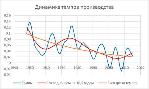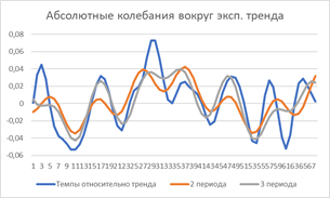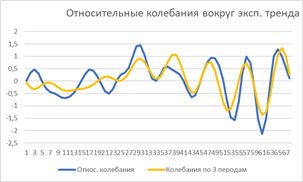 Рисунок 1. Динамика производства товаров длительного пользования в США за 1947-2016 годы (фактическая и с удалением шума). Рисунок 2. Динамика темпов развития производства с выделением среднесрочного тренда с удалением коротких колебаний и долговременного апериодического экспоненциального тренда. На рисунке 3 представлены абсолютные и относительные колебания темпов относительно апериодического тренда и результаты попыток их аппроксимации суммой 2 и 3 гармонических колебаний.